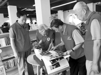 社区退休党员在“红旗书屋”里翻看大型图册《中国》。