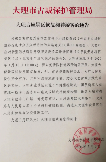 3月9日,云南省大理市古城保护管理局发出通告,宣布大理古城景区于2020年3月10日12:00起,面向疫情防控低风险地区开放。