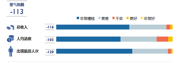 《报告》指出,受疫情影响,从业者对2020年上半年出境旅游市场的整体业绩预期极为悲观。与去年同期相比,景气指数大跌113个指数点,至-113。同时,出境旅游人次、人均消费及总收入三项指标的市场预期较2019年上半年均有大幅下滑,其中受疫情于全球蔓延的影响,从业者对出境旅游人次的预期负面性最高。