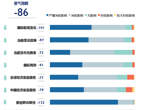 整体而言,从业者预期以上7项因素均将对2020年上半年出境旅游市场业绩产生负面影响,导致整体景气指数下降至-86。其中,正于全球蔓延的新冠疫情被认为是限制出境旅游市场发展的最主要因素。