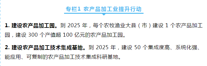 提升农产品精深加工。引导大型农业企业加快生物、工程、环保、信息等技术集成应用,促进农产品多次加工,实现多次增值。发展精细加工,推进新型非热加工、新型杀菌、高效分离、清洁生产、智能控制、形态识别、自动分选等技术升级,利用专用原料,配套专用设备,研制专用配方,开发类别多样、营养健康、方便快捷的系列化产品。推进深度开发,创新超临界萃取、超微粉碎、生物发酵、蛋白质改性等技术,提取营养因子、功能成分和活性物质,开发系列化的加工制品。