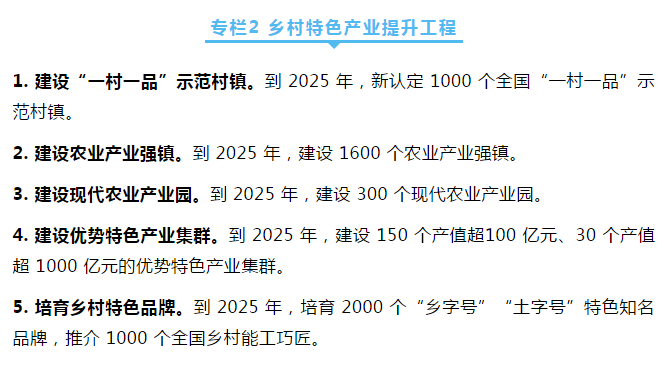 到 2025 年,乡村产业体系健全完备,乡村产业质量效益明显提升,乡村就业结构更加优化,产业融合发展水平显著提高,农民增收渠道持续拓宽,乡村产业发展内生动力持续增强。