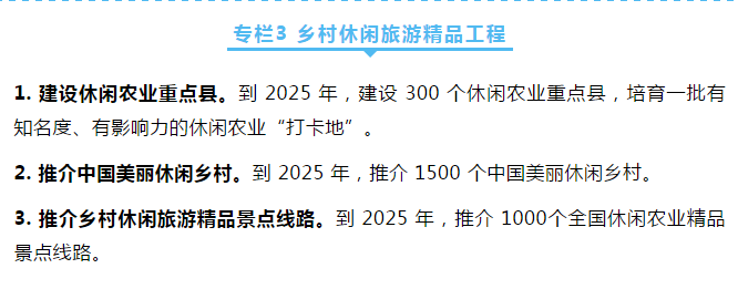 ——乡村休闲旅游业优化升级。农业多种功能和乡村多重价值深度发掘,业态类型不断丰富,服务水平不断提升,年接待游客人数超过 40 亿人次,经营收入超过 1.2 万亿元。