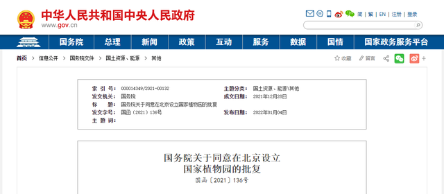 2021年12月28日,国务院公开发布《关于同意在北京设立国家植物园的批复》(以下简称《批复》)。《批复》称,国务院已同意在北京设立国家植物园,由国家林草局、住房城乡建设部、中科院、北京市人民政府合作共建。
