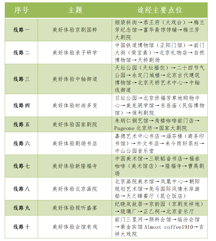 本次精心设计推出的10条“漫步北京-美好体验艺术之旅主题游”线路覆盖了十三艺节北京各主要展演场馆,结合场馆特点和周边文旅资源,以展演场馆为核心,以慢行交通系统为纽带,以文化场所、旅游景点、网红打卡地为节点,主题鲜明、规划合理,带领市民游客观演出、看展览、赏风景、品美食,共享“艺术的盛会、人民的节日”。