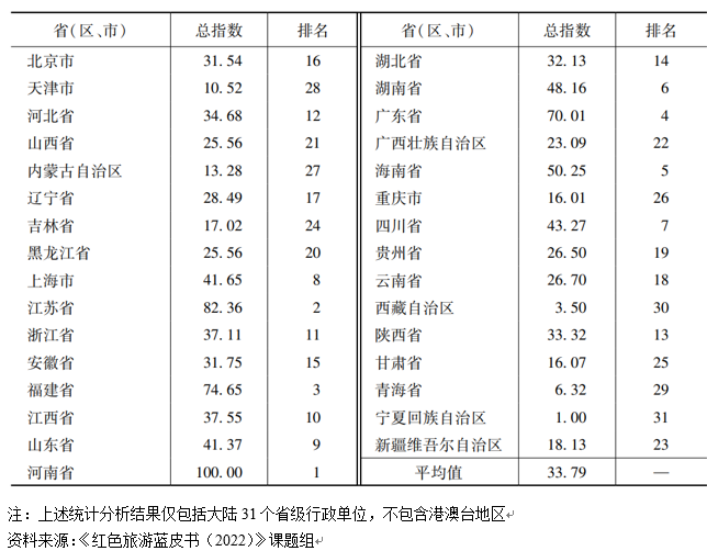 近日,北京第二外国语学院旅游科学学院与社会科学文献出版社共同发布了红色旅游蓝皮书《中国红色旅游发展报告(2022)》(以下简称《蓝皮书》)。《蓝皮书》指出,中国红色旅游发展水平持续提升,31个省级行政单位(不含港澳台地区)的红色旅游发展指数排名中,位列前十的依次为河南省、江苏省、福建省、广东省、海南省、湖南省、四川省、上海市、山东省、江西省。