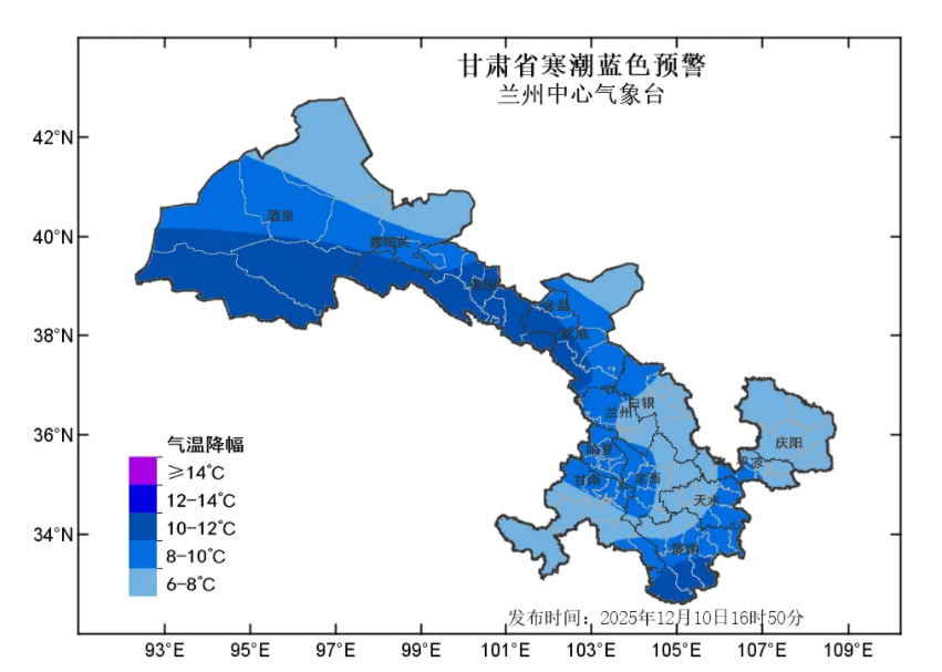 兰州中心气象台2025年12月10日16时50分发布寒潮蓝色预警:预计11日至13日清晨,全省大部自西向东最低气温下降6-8℃,其中河西五市、陇南等部分地方及陇中局部地方下降8~10℃,局地可达10℃以上,上述部分地方将出现寒潮。河西五市降温时段为11日白天至12日白天,省内其余地方降温时段为11日夜间至13日清晨。请注意防范!